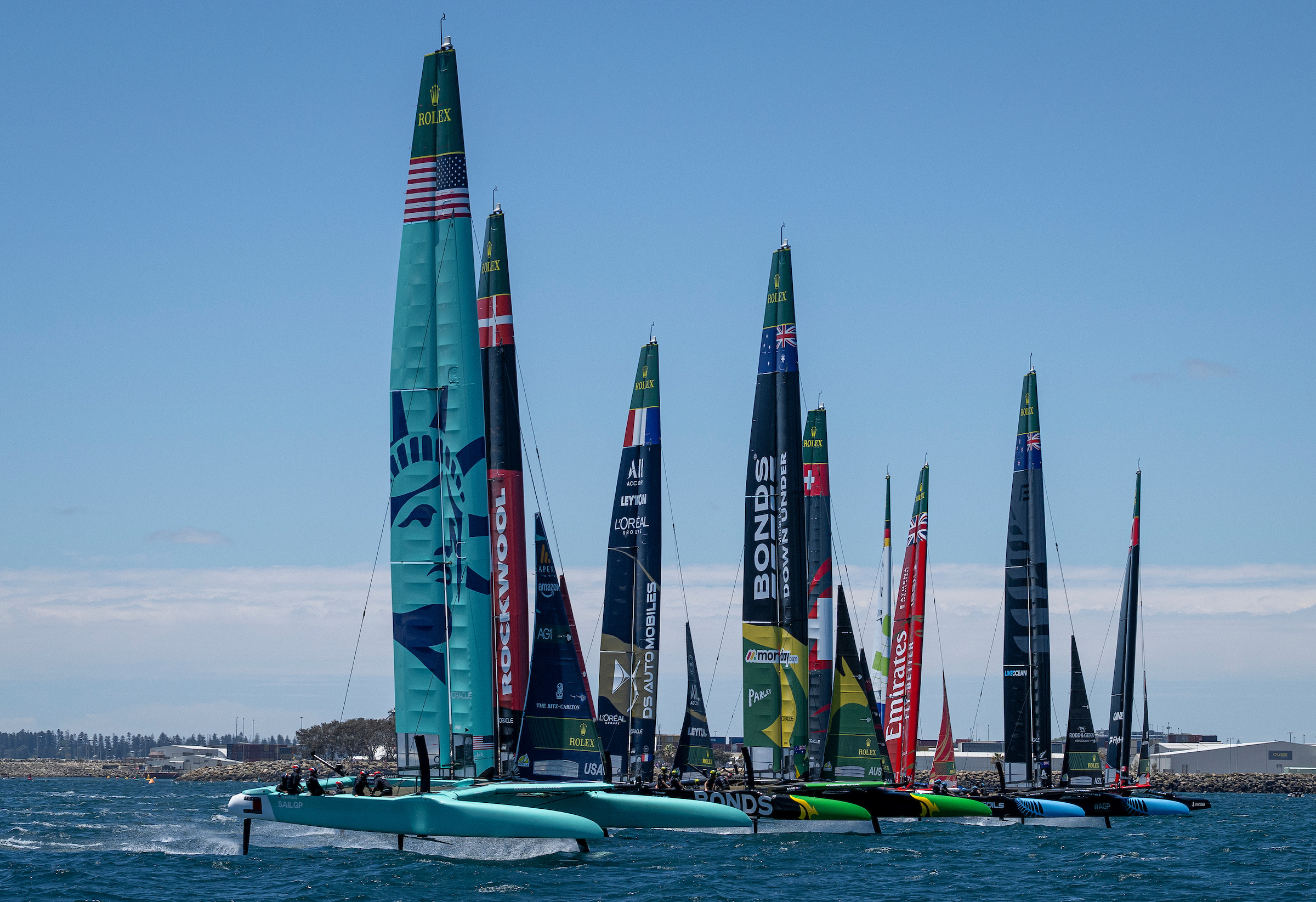 United States SailGP Team helmed by Taylor Canfield leads the SailGP F50 catamaran fleet over the start line ahead of the first action of the season on Race Day 1 of the Oracle Perth Sail Grand Prix presented by KPMG in Perth, Australia. Saturday 17 January 2026. Rolex SailGP Championship Event 1 2026 Season. Photo: Ricardo Pinto for SailGP. Handout image supplied by SailGP