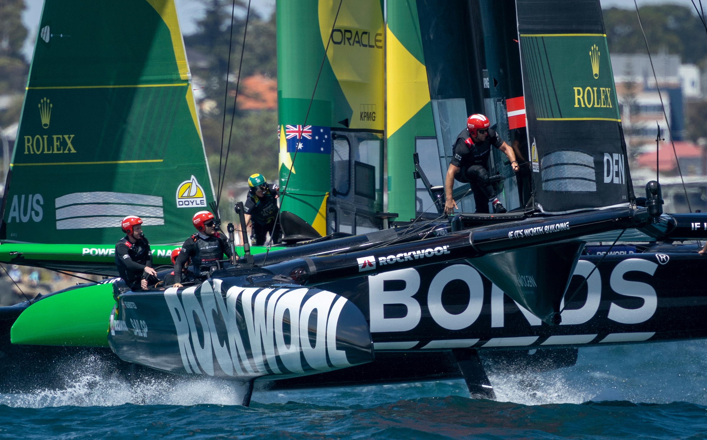 ROCKWOOL Racing SailGP Team helmed by Nicolai Sehested in action on Race Day 1 of the Oracle Perth Sail Grand Prix presented by KPMG in Perth, Australia. Saturday 17 January 2026. Rolex SailGP Championship Event 1 2026 Season. Photo: Samo Vidic for SailGP. Handout image supplied by SailGP